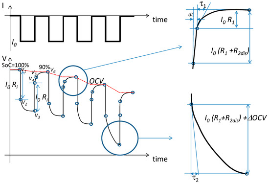Let us consider the steady state values of the voltage of the battery cell as reported in Figure 4: , , and . and are the values of the voltage one sample after the falling and rising steps of the input current. is the value of the output voltage a short time, dt, after the rising step.