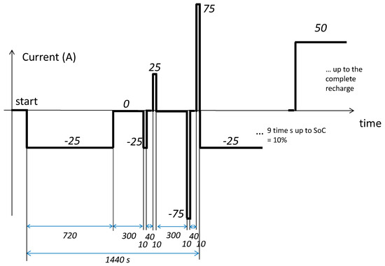 The test current profile—lightly modified with respect to the classic HPPC—is reported in Figure 5. A constant current of 25 A was taken from the battery for 720 s, corresponding to a charge of 25 A× 720 s × 1 h / 3600 s = 5 Ah; that is, 10% of the nominal capacity of the cell. Two consecutive discharge and charge current pulses of 25 A were applied after a rest period of 300 s. After another rest period of 300 s, two further consecutive discharge and charge current pulses of 75 A were applied. The pulses were used to verify the independence of with the value of the current applied. They do not modify the SoC. The cycle was repeated nine times, so that the SoC reached 10% of its nominal capacity. Finally, a 50 A constant current was applied up to the complete recharge of the battery.