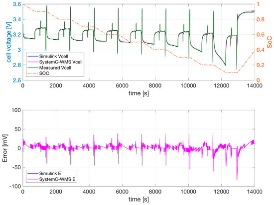 SystemC-WMS is a free SystemC library that can be downloaded from Reference [37]. The advantage of the use of SystemC-WMS is the ability it provides to easily integrate the single cell model into a complex framework including, for example, the battery management system, the CAN bus [24,25], and the mechanical model of the electrical engine driven by the battery.