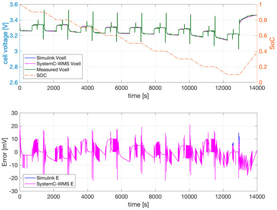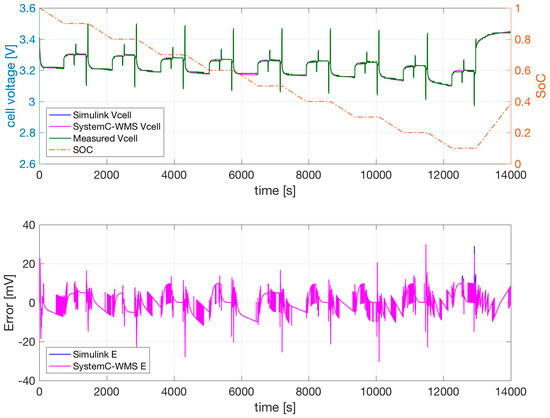 Measured voltage, SoC, SystemC-WMS, and Simulink simulations of the model of Figure 1b with parameters obtained with the extraction procedure and optimization. T = 40 °C. The lower part of this figure shows the error between SystemC-WMS and measurements and between Simulink and measurements.
