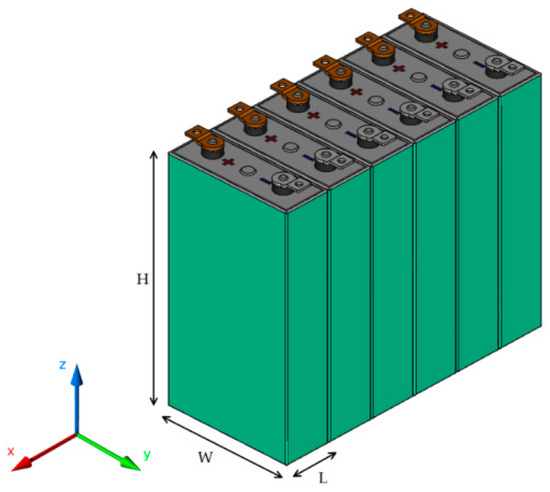 In this paper, we assume that the inner cell temperature is uniform and that heat generation is uniformly distributed within the cell. Heat conduction and convection are assumed to be the only forms of heat transfer between the internal cell and the ambient environment. For single-cell modeling, thermal resistance is negligible with respect to and , and it is not reported in Equations (3) and (4), where the heat flow transferred by conduction effect equals that absorbed by convection.
