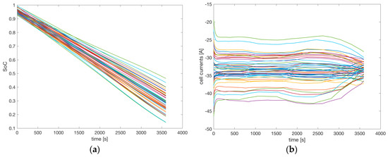 Figure 12a shows the SoC of the 48 cells. Figure 12b shows the current driven from each cell. The initial SoC starts from an average value of 95% with the imposed statistical variations. Due to different values of the parameters of the cells (e.g., a random shift of the OCV between the cells), the cells connected in parallel provide different currents: the one with the highest OCV provides higher current than the one with the lowest OCV. Since the total current driven is 200 A, the average among the six cells is 33.33 A. Figure 12b shows the current variations. The cells providing higher current discharged more rapidly than the others, as can be seen in the slope of the SoC in Figure 12a. Therefore, at the end of the simulation some of the cells have an SoC close to 10%, while others have an SoC close to 50%. The OCV decreases rapidly when the cell is close to complete discharge, as shown in Figure 6a. The cells that gave higher current in the first part of the discharge had less SoC at the end of the discharge, and therefore reduced the current they provided. The reduction of the variations between the currents at the end of the simulations shown in Figure 12b evidences this effect.