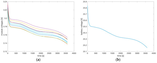 Figure 13a shows the output voltage over time of the eight packs connected in series, and Figure 13b shows the voltage of the complete battery. The initial voltage drop in the first 200 s is due to the internal resistors and capacitors of the cells, then the voltages decrease due to the reduction of the SoC. The variations among the output voltages of the eight battery packs are evident, although the parallel connection of the six cells in each pack partially averages the variation among the six cells. The variations among the eight packs in series are mainly due to the variation on the OCV. At the end of the simulation, some of the cells have a low SoC, causing a reduction on the OCV and therefore a reduction of the output voltage of some of the packs in series (shown in Figure 13a), and globally the reduction of the total output voltage (see Figure 13b).