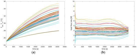 Figure 14b shows the 48 heat flow rates of each cell. The variations are mainly due to the different currents flowing in each cell. The effect of the temperature variation on the parameters of the cell (OCV and internal resistances) are considered by the simulation environment. On the other hand, the effect of a cooling and heating battery system can be considered by simply changing the thermal parameters of the model.