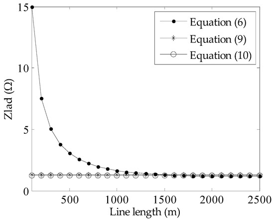 The impedance calculation result based on Equation (10) is compared with the results from Equations (6) and (9) for an example system. The parameters for the MGN system are: and . The estimation results for the equivalent impedance of the ladder network are shown in Figure 5. It is apparent that the equivalent impedance of the ladder network reaches a constant value when the length of the ladder network is larger than 1000 m.