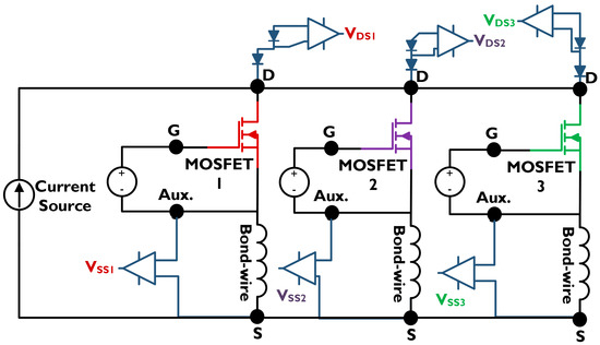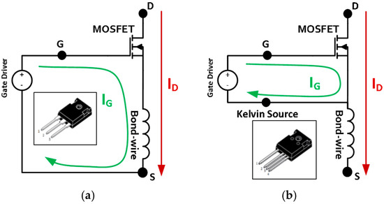 Figure 1 demonstrates the above principle. In the traditional three-terminal arrangement (Figure 1a), the fast drain current transient during switching causes a voltage drop across the common parasitic inductance of the source bond-wires. This induced voltage is in opposition to the driving voltage, and consequently slows down the switching transient and increases energy loss [1,2]. To avoid the common source inductance, an additional terminal known as the kelvin-source is used, as shown in Figure 1b.