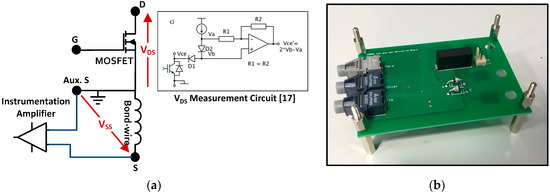 The principle of the on-state measurements in this article are shown in Figure 3. The kelvin-source connection is used as the ground reference for two voltage measurements. The first measurement is of the drain to kelvin-source voltage (VDS). Here, the measurement circuitry from [17] is used, which uses a blocking diode to protect the measurement amplifier circuit against high voltages when the MOSFET/IGBT is in the off-state. The second measurement—of the kelvin-source to source voltage (VSS)—uses only an LT1167 instrumentation amplifier, since this does not experience the high voltage of the drain terminal. The outputs of the two amplifiers are connected to a 14-bit two-channel Analogue-to-Digital Converter (ADC): an AD7367. The presented measurement circuit can be used for both high and low side switches.