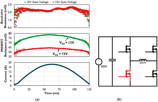 Figure 4. (a) MOSFET and bond-wire resistances at different gate voltages for one sinusoidal half-period in a single-phase inverter. MOSFET resistance is calculated using VDS, while bond-wire resistance is calculated using VSS; (b) H-bridge inverter schematic (red MOSFET is the Device under Test).