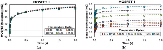 Figure 6. (a) MOSFET resistance throughout the 2 s current pulse, after increasing numbers of temperature cycles throughout the power cycling test; (b) Bond-wire resistance throughout the 2 s current pulse, after increasing numbers of temperature cycles throughout the power cycling test.