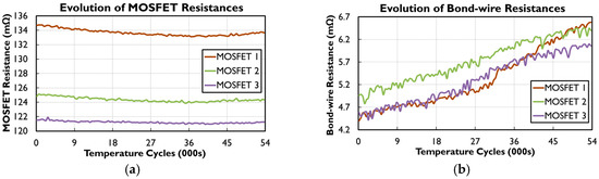 Figure 7. (a) Evolution of MOSFET resistances throughout the power cycling test; (b) Evolution of bond-wire resistances throughout the power cycling test.