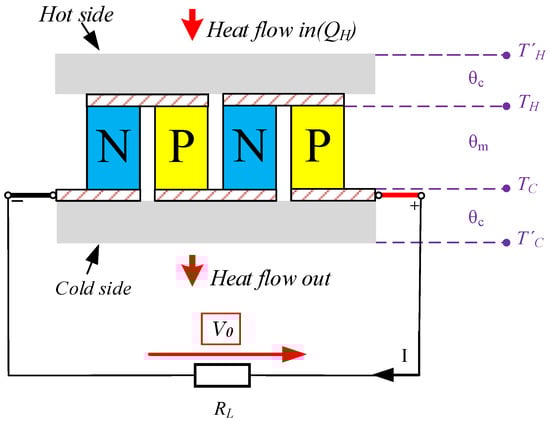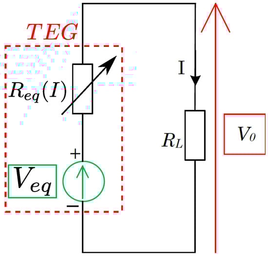 In some practical applications, as in the case of automobile exhaust gas thermal energy recovery systems [], TEGs are subject to a constant thermal input heat flow instead of a constant temperature gradient. Under constant heat flow conditions, with the contact thermal resistance neglected, the TEG can be electrically modeled with an equivalent constant voltage whose analytical expression is given by Equation (5), in series with an equivalent internal electrical resistance whose analytical expression is given by Equation (6) []: