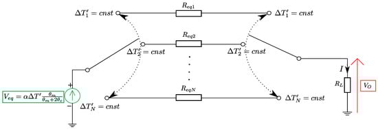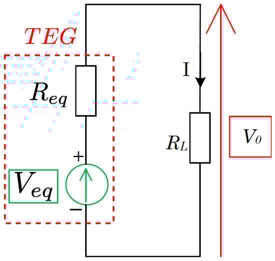 In the literature, TEGs are mostly considered under constant temperature gradient conditions [,]. The influence of the internal contact thermal resistance is usually neglected. Under these conditions, a TEG can be analytically modeled with an equivalent constant voltage source in series with an equivalent internal resistance [,] given by: