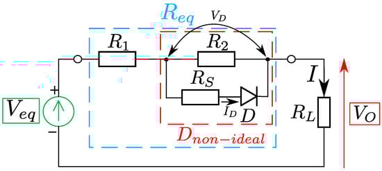 In the equivalent electrical circuit presented in Figure 4, the diode parameters should also be determined. The relationship between the current I flowing through the load and the diode terminal voltage is given by (see Figure 4):