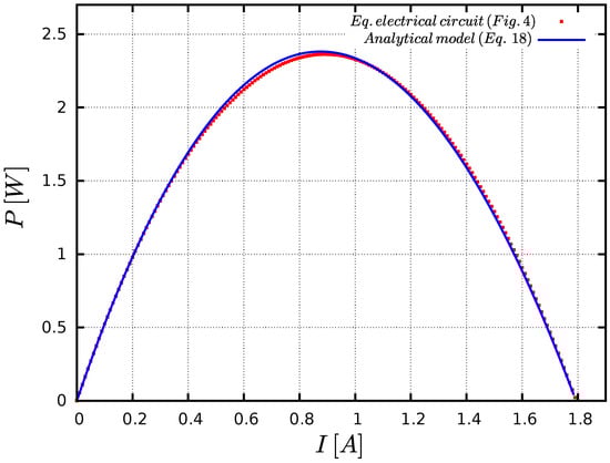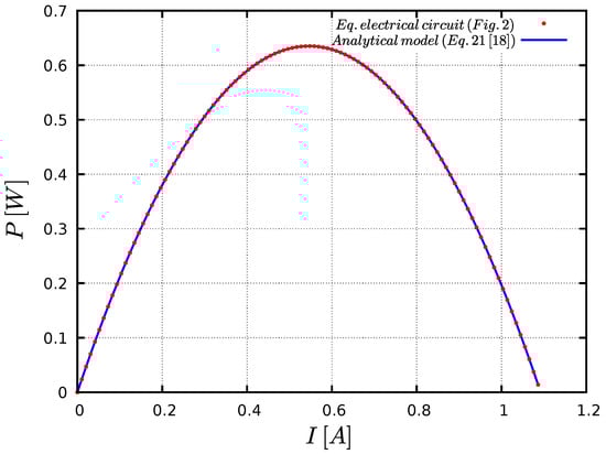 These results are presented in Figure 5 and Figure 6. Figure 5 shows that the electrical power of the TEG module obtained with the proposed equivalent electrical circuit () and the one obtained with the exact analytical model are superimposed. On the other hand, from Figure 6 it can be seen that the power obtained with the proposed equivalent electrical circuit () matches very closely the exact one described with the Equation (18). The observed error is below 1%.