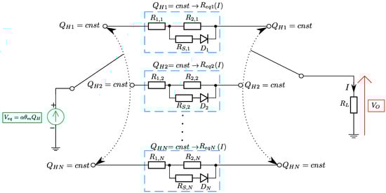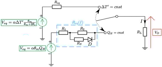 The equivalent electrical circuits of a TEG under static operating conditions, where either the temperature gradient between TEG’s terminals is kept constant or a constant heat flow applied to it, is summarized in Figure 7 and Table 3. Each operating mode is characterized by its own parameters: the constant temperature gradient by a DC voltage source whose value is directly proportional to , in series with an equivalent resistance depending on the TEG’s parameters and ; the constant heat flow by a DC voltage source whose value is directly proportional to , in series with a variable resistance block composed of two resistances and and a diode D in parallel with the latter, playing the role of the current-dependent resistance.