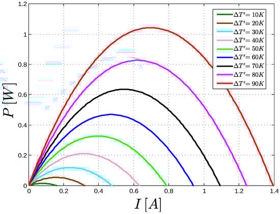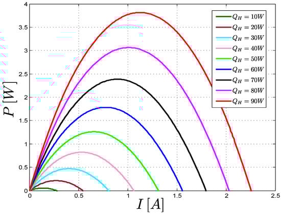 Figure 10 shows the evolution of the electrical power delivered to the load by the TEG equivalent circuit in the constant temperature gradient mode under dynamic operating conditions. The electrical power delivered to the load is presented versus load current I for different values of temperature gradient (from 10 C to 90 C) for a TEG module with the parameters shown in Table 1. These curves are obtained using the electrical model presented in the previous section, where for each temperature gradient the values of the electrical circuit’s parameters, the voltage source and the resistance are calculated again. From Figure 10, it can be seen that the electrical power delivered to the load increases with the temperature gradient increase, which is the expected outcome. Moreover, Figure 11 shows the evolution of this power in the constant heat flow mode also under dynamic operating conditions. The electrical power delivered to the load is also presented versus load current I, for different values of heat flow (from 10 W to 90 W) for a TEG with parameters given in Table 1. These curves are similar to those presented in Figure 10. Even in the case of heat flow mode, it can be seen that the output electrical power P delivered to the load increases with the heat flow applied to the TEG. For all curves presented in Figure 10 and Figure 11, the observed error compared with the analytical model is below 1%.