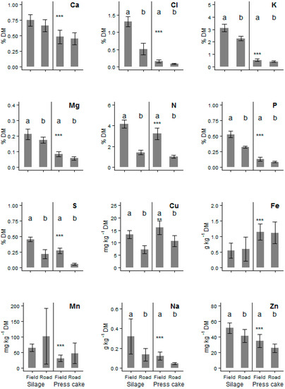 Element concentrations in grass from sports fields and urban roadside verges (2 cuts) for comparison. Data for urban roads are taken from [12], apart from Fe data, which are based on own measurements. The letters (a and b) indicate significant differences between silages and press cakes of different proveniences. Asterisks indicate significant differences between the silage and press cake of sports fields (**, p < 0.01; ***, p < 0.001).