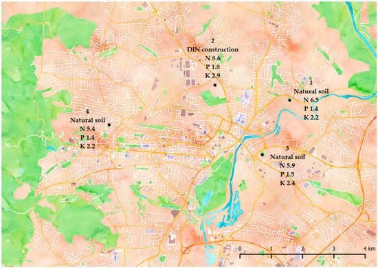 Location of investigated sports fields within the city of Kassel. Soil construction and fertilization in spring 2015 is given. N, P, and K fertilization refers to g·m−2·year−1. Underlying map: OpenStreetMap contributors [26].
