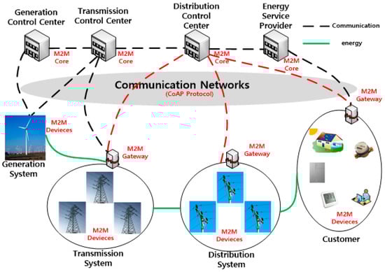 Recently, machine-to-machine (M2M) communication has been developed for a variety of services. The Internet of Things (IoT) is the resulting global interconnection of smart objects using extended Internet technologies []. Because power systems are built across geographically large areas, they need to be connected to such an Internet network using a smart grid. The ETSI TS 102 690 recommends M2M functional architecture, made possible by a web service [].