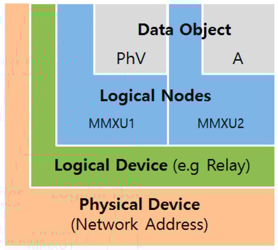 The IEC 61850 information model is shown in Figure 2. The information model is an abstract representation of the devices inside the substation. The logical devices (LDs) comprise a virtual representation of physical devices, such as relays or bays, in the substation. A LD includes many logical nodes (LNs). LNs are virtual representations of device components such as switches, circuit breakers, and voltage meters. A data object (DO) is a representation of the common information in various nodes. All devices follow a common naming scheme, so that devices from different manufacturers may be permitted to access the same device [,,,].