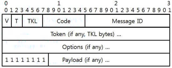 CoAP message format is shown in Figure 3. A CoAP message is encoded in a simple binary format, which includes a four-byte fixed header. It then comprises token length, code, message ID, token, option, and payload. The code includes message types and methods (GET, POST, PUT, DELETE), which can replace the services of the current system. The GET method retrieves a representation of information that corresponds to the resources identified by the request URI. The POST method requires that the enclosed representation to be created, processed, or changed in the request. The PUT method requests that the resource identified by the request-URI be updated. The DELETE method requests that the resource identified by the request URI is deleted. The token is represented by the URI information [].