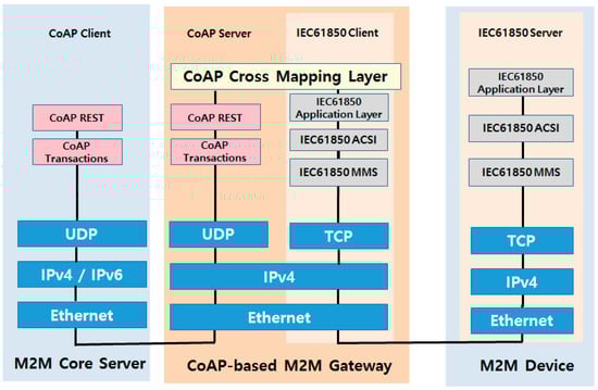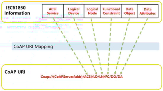 The protocol structure for application layer mapping between the IEC 61850 and CoAP is shown in Figure 5. The IEC 61850 and CoAP reference the OSI 7 layer communication standard. The IEC 61850 uses a TCP in the transport layer, as well as a manufacturing message specification (MMS) and abstract communication service interface (ACSI), in the application layer. MMS is an international standard (ISO 9506) that has been developed and maintained by the ISO TC184. ACSI defines common utility services for substation devices. However, CoAP uses UDP in the transport layer, and is based on CoAP in its application layer. Therefore, a CoAP cross-mapping layer is needed because the IEC 61850 and CoAP have different transmission and application layers. CoAP cross-mapping layer maps the FCs from the IEC 61850 data model and CoAP method, in addition to the IEC 61850 data model and CoAP URI. FC information makes it possible to access various parts of the information model.