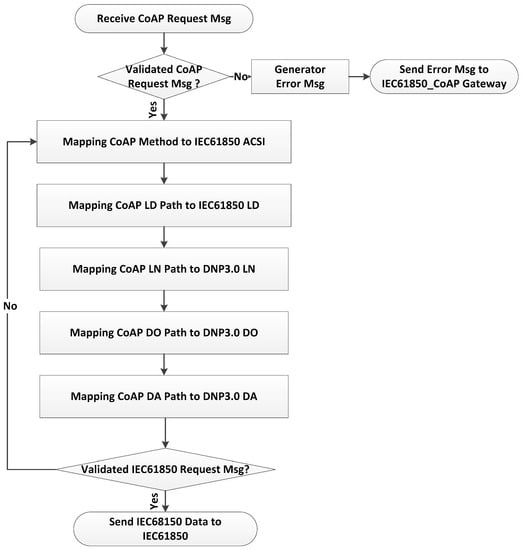 CoAP-to-IEC 61850 mapping process within a CoAP cross-mapping layer is shown in Figure 7. CoAP_to_IEC 61850 stream receives and validates request messages from CoAP. If a request is determined to be invalid, the IEC 61850 should send an error message to the M2M core. If the request is deemed valid, the IEC 61850 should analyze the received message and extract CoAP and URI path information.
