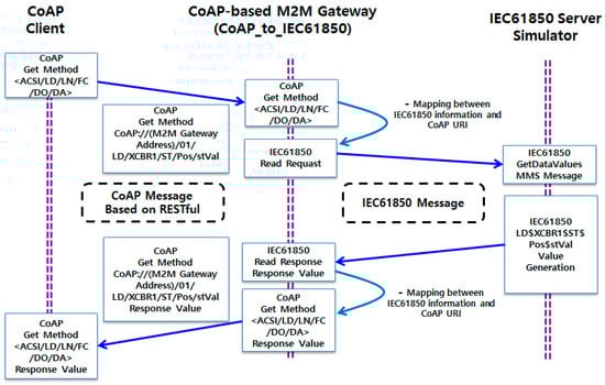 Figure 8 shows a sample message sequence chart between the IEC 61850 and CoAP. Here, CoAP client sends a CoAP message to the IEC 61850 slave via a CoAP-based M2M gateway in the following manner: