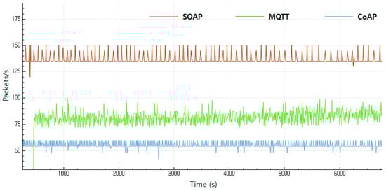 The protocols requested the same data for the same period, as shown in Figure 9. SOAP delivered an average 140 packets per second. MQTT delivered an average 80 packets per second. CoAP delivered an average 57 packets per second. CoAP is more efficient than SOAP or MQTT when transmitting the same data. There is also a difference in data sizes between the CoAP (average 67 bytes), the SOAP (average 400 bytes), and the MQTT (average 166 bytes). The CoAP data size is more than smaller than that of SOAP or MQTT when transmitting the same information. Thus, CoAP gateway was useful in the ETSI M2M environment because device capability was able to be limited.