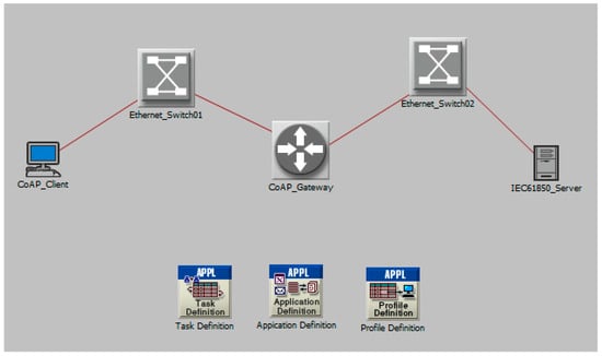 The CoAP gateway network performance diagnostic was described using the OPNET Modeler 17.1 running in an Ethernet environment (line model Ethernet 10BaseT). Here, packets arriving to the buffer follow a Poisson distribution. A node was created which operated as a buffer, specifically as an infinite queue, wherein the first to come was the first served (FIFO), a process also known as a M/M/1 queue. The area of performance tests were classified into IEC 61850 and CoAP. CoAP returned a result from interactions between a CoAP_client and a CoAP_gateway. The IEC 61850 returned a result from interactions between a CoAP_gateway and an IEC 61850_server. OPNET Simulator used the test parameters [ACSI: GetdataValues and SetdataValues, Logical Device: LD, Logical Node: XCBR1, Functional Constraint: ST, Data Object: Pos, Data Attribute: stVal]. Figure 10 shows the network topology in OPNET Modeler 17.1. This experiment was performed to demonstrate why CoAP is used as the external interface of the substation using the IEC 61850. The efficient compatibility of CoAP communication using the IEC 61850 model was also demonstrated.