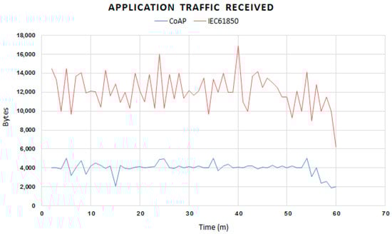 Figure 11 shows the average traffic received (bytes/s) for CoAP and IEC 61850 applications. The IEC 61850 contained TCP information, MMS information, and IEC 61850 model information; whereas, CoAP contained a CoAP URI and UDP information. The IEC 61850 traffic received (approximately 12,000 bytes/s) was higher than CoAP traffic Received (approximately 4000 bytes/s). When a number of IEDs were connected to a M2M core server, it was more efficient to transfer information converted to a CoAP, since CoAP facilitated more efficient network traffic.