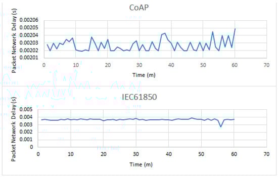 Figure 12 shows the packet network delay for CoAP and IEC 61850 applications. The packet network delay was negatively affected by the traffic. The IEC 61850 was based on the TCP transport protocol, which is a connection-oriented protocol. As such, it sent an additional ACK message. Doing so also had an impact on the network delay. Thus, the IEC 61850 packet network delay (approximately 0.0037 s) was higher than CoAP packet network delay (approximately 0.002 s). The total packet network delay was less than 0.006 s, on average.