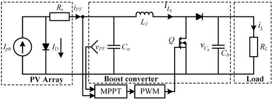 The PV system generates electricity from solar irradiance. The PV structural unit contains solar cells. The entire layout of the PV system interconnecting with the load is shown in Figure 1. The system is comprised of a DC-DC boost converter. The dynamic model of the PV system can be represented by three differential equations given as [42]: