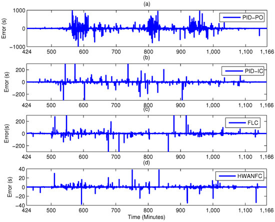 The irradiance level varies over a day depending on the appearance of sun. From Figure 4, the Sun rises at 6:04 h (424 min) and sets at 19:26 h (1166 min). During the day time, the average solar irradiance level reaches 1000 W/m2. Similarly, the average temperature during the night time is 20 C, while in the day time, it reaches up to 42 C. The HWANFC for the PV system tracks the MPP by keeping the slope close to zero. In order to analyze the performance of HWANFC, a PID controller-based IC and P&O and FLC are also used to track the MPP of the PV system. Figure 5 shows the performance of different controllers. The random spikes are due to the rapid change of solar irradiance. As the irradiance level changes, the MPP alters its position, which in turn changes the value of s. After that, the controller tries to minimize this error by adjusting the duty cycle. From the figure, the P&O algorithm-based PID controller error is up to 1000. Similarly, with IC-PID and FLC, the maximum error reduces to 250, while the HWANFC achieves the MPP so quickly and efficiently that the maximum error spike does not exceed 40.