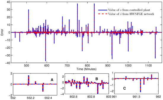 The comparison between error term s acquired by the controlled plant and the HWNFGE generated error is illustrated in Figure 6. From the figure, it is clearly observed that the HWNFGE accurately identifies the network and calculates the error term efficiently. However, at large values of s (due to the rapid change in irradiance level), the value of is slightly less than the experimental error. In order to analyze the error difference more accurately, various zoomed sub-figures at different timings are shown in Figure 6A–C.