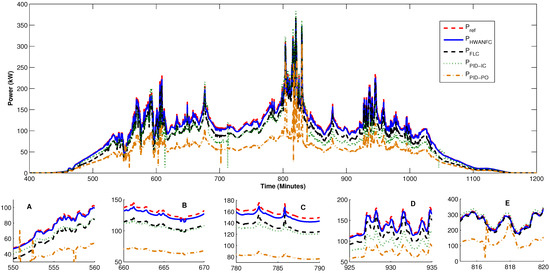 The output power comparison of the PV array regulated with HWANFC, FLC, PID-based IC and PID-based P&O along with reference power are shown in Figure 7. Throughout the day, the various undershoots and poor response of P&O and the IC technique are clearly analyzed from Figure 7. At t = 785 min (Subfigure C), the power loss between the reference power, P&O and IC technique reaches 80 kW and 30 kW, respectively. The FLC response is comparatively better than the IC technique. However, the proposed HWANFC out-performs the FLC.