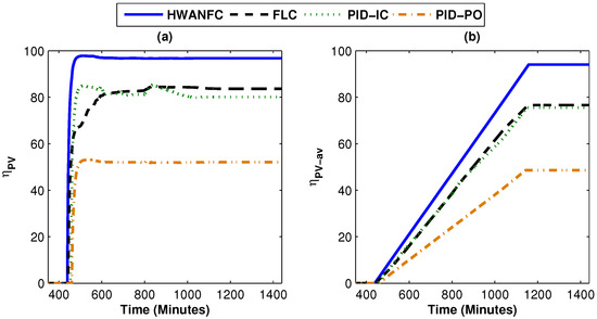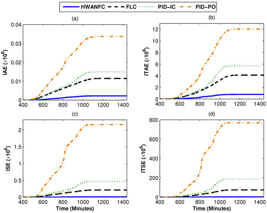 where . Figure 8 shows the simulation results of and , whereas Figure 9 corresponds to IAE, ITAE, ISE and ITSE. From Figure 8a, the PV efficiency for HWANFC reaches 96.81 and then keeps constant, while other controllers’ efficiencies fluctuate with time. Similarly, the mean efficiency for HWANFC linearly increases with a certain slope with respect to the others. In Figure 9, as time increases, the accumulative error of each controller increases. However, the proposed HWANFC index is less among all other controllers.