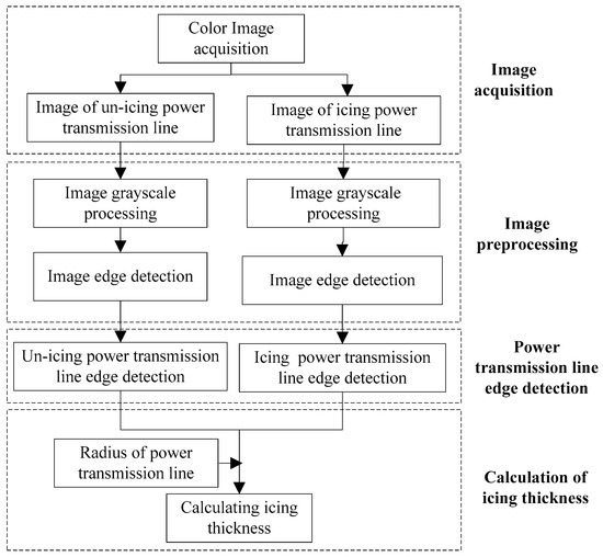 Firstly, the grayscale images of un-iced power transmission lines and iced power transmission lines are obtained by grayscale processing. Secondly, according to the principle of preserving power transmission line edges and removing non-edges, we set the self-adaptation dual threshold based on image gradient change and then detect the image edges by a Canny operator. Thirdly, the Hough transform is combined with the least squares method to accurately detect power transmission line edges and get pixel coordinate equations of optimal single pixel edges. Finally, according to the imaging principle of the camera and the real radius of the un-iced power transmission line, the geometric calculation model for icing thickness is established to achieve automatic calculation of icing thickness.