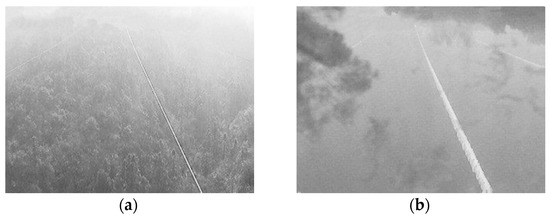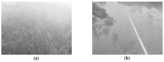 The grayscale images of Figure 2. (a) A grayscale image of an un-iced power transmission line; (b) A grayscale image of an iced power transmission line.