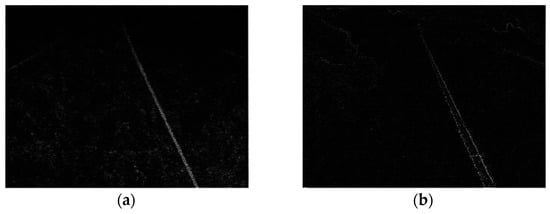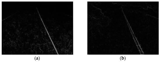 Moreover, it is observed that pixels with gradient amplitude greater than 50 in Figure 8 are substantially located at the edge of the power transmission line, and then parts of pixels with gradient amplitude greater than 25 are also located at the edges, so the high threshold value of Figure 8a,b can be 50, and then the low threshold value of Figure 8a,b can be 25. Based on dual threshold, we further determine the image edges. Finallly, after determining the image edges, we set the gray values of the edge pixels to 255 and the gray values of the non-edge pixels to 0 to get the binary edges of image, as shown in Figure 9. As can be seen from this figure, while carrying on the edge detection, we have retained the edges of the power transmission line to the greatest extent possible, and removed some non-edges of power transmission line.