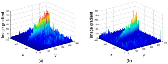 The three-dimensional display image of the gradient amplitude, among them, the pixel coordinates of the image are used as the x-axis and y-axis, and the gradient amplitude (or gray value) of the pixel is used as the z-axis. (a) The gradient amplitudes of pixels in Figure 7a; (b) The gradient amplitudes of pixels in Figure 7b.