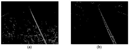 The binary image edges after dual threshold edge detection. (a) The binary image edges of an un-iced power transmission line; (b) The binary image edges of an iced power transmission line.