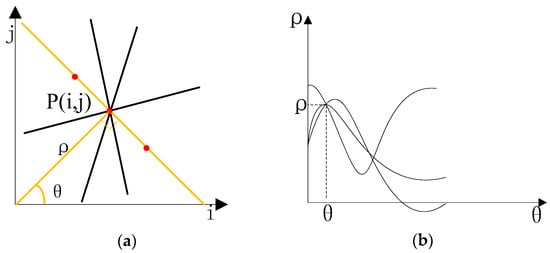 We assume straight lines of n directions for each pixel point P(i, j), (n = 180, the angular accuracy of the detection line is 1°) and then calculate the (, ) coordinates of the n straight lines separately, as shown in Figure 11. Finally, we can get the corresponding polar coordinates of n straight lines of all pixel points. Therefore, a point in the image space corresponds to a sinusoidal curve in the parameter space, while collinear points in the image space intersect at the same point in the parameter space.