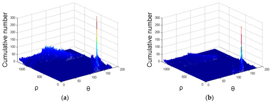 Based on the mapping relationship between the image space i-j and the parameter space -, we detect the pixels of image edges in Figure 9, and then calculate under all , at the same time, accumulate the occurrence number of under . The results are shown in Figure 12.