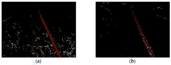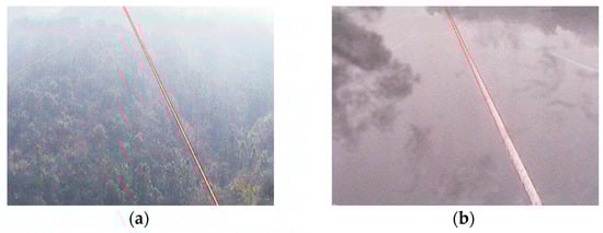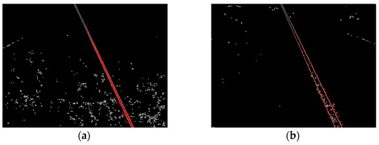 We set the color of detected power transmission line edge pixels to red by setting PL = 100. The rough positioning results of the power transmission line edge after Hough transform are shown in Figure 13 with the red color pixels.