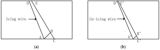 Schematic diagram of the power transmission lines. (a) Image schematic diagram of an iced power transmission line; (b) Image schematic diagram of an un-iced power transmission line.