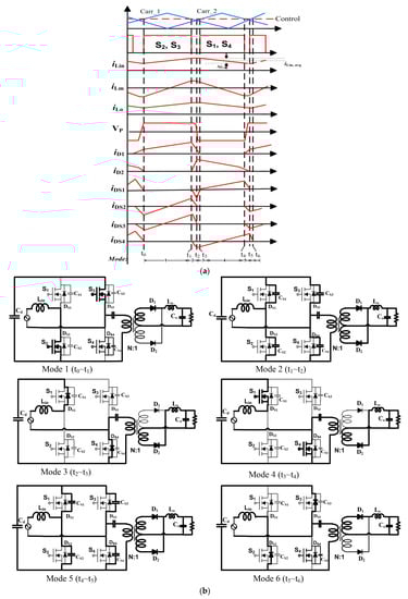 A high-gain DC-DC converter has been introduced to obtain high dc-link voltage from the low voltage battery bank [31]. SR has been applied to decrease the conduction losses and force the circuit to operate under ZVS conduction. In order to get the high-voltage gain, coupled inductor is utilized with LP and LS as primary and secondary winding inductance respectively. The characteristic waveform and modes of operation of the DC-DC converter is shown in the Figure 4.