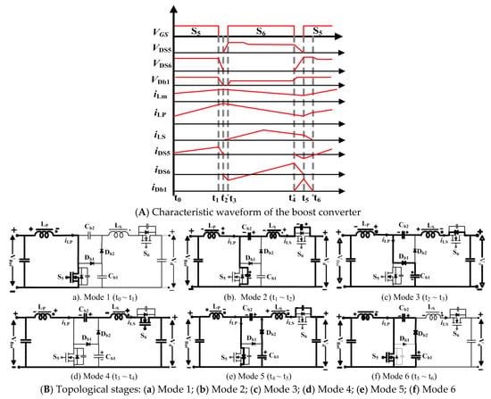 DC-DC boost converter; (A) Characteristic waveform; (B) Topological stages.