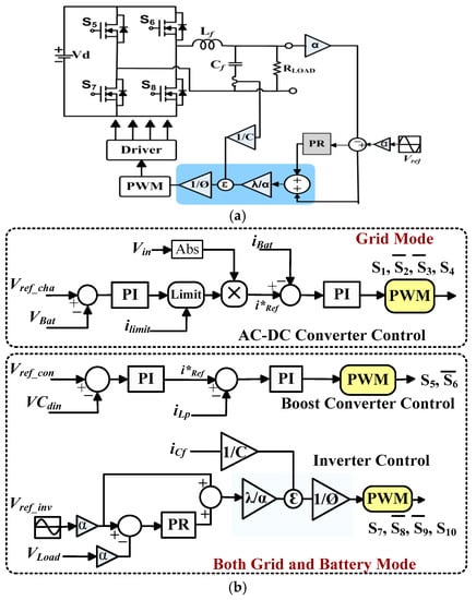 The circuit diagram of a single phase inverter with LC filter and proposed controller for non-linear load is shown in Figure 5a, where Vd is the applied DC-link voltage, Vout the filter capacitor Cf output voltage. iLf is the inductor Lf current and io the output current through the load R, given by io = Vout/RLoad. The state equations of the inverter are given as: