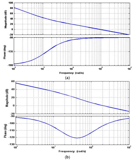 The stability of the converter can be analyzed using the Bode plot shown in Figure 7. The system shows good stability with a positive phase margin and it has no right half plane poles. It is easy to achieve high crossover frequencies by adjusting a suitable gain of the compensators as the phase never reaches −180. The voltage across DC-link capacitor Cdin is regulated by using a suitable voltage compensator [37]. The PI compensator is used to track the DC-link voltage Vd to follow the reference voltage, as shown in Figure 7.